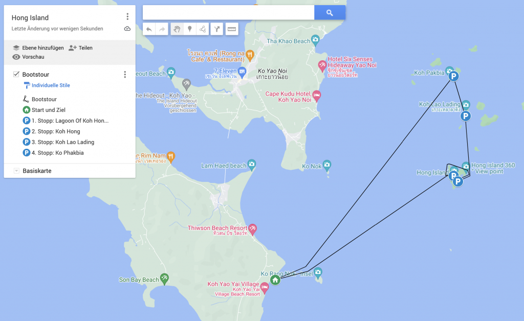 Anbei unsere Route der Bootstour. Wir haben an vier wirklich zauberhaften Orten gehalten.