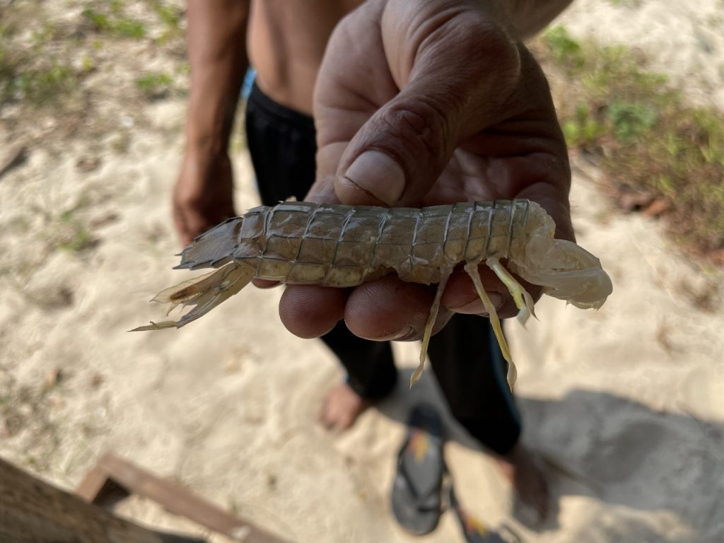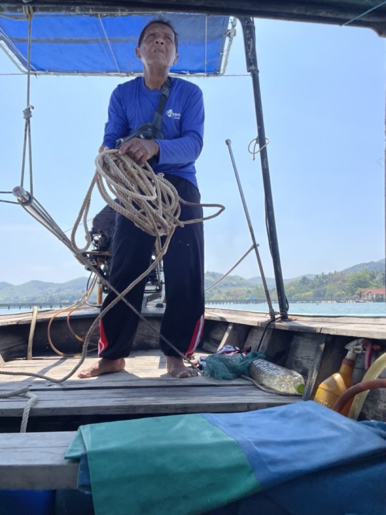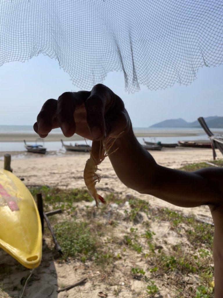 Das haben wir auch ganz spontan heute abgesprochen. Eigentlich wollten wir zu unserem Wäscheservice fahren, um dort unseren heutigen Trip zu besprechen und auch noch einmal Wäsche dort abzugeben. Als wir heute dann nach dem Frühstück am Strand bei unserem Kaffee saßen, tauchte er plötzlich auf. So konnten wir mit ihm den Trip abstimmen und er hat auch gleich unsere Wäsche mitgenommen. Und da er hier viele Leute kennt, hat er uns auch gleich mal gezeigt, was hier von den Fischern aus dem Wasser gezogen wird. Wir haben uns sehr darüber gefreut, dass wir heute auch den gleichen Kapitän hatten.