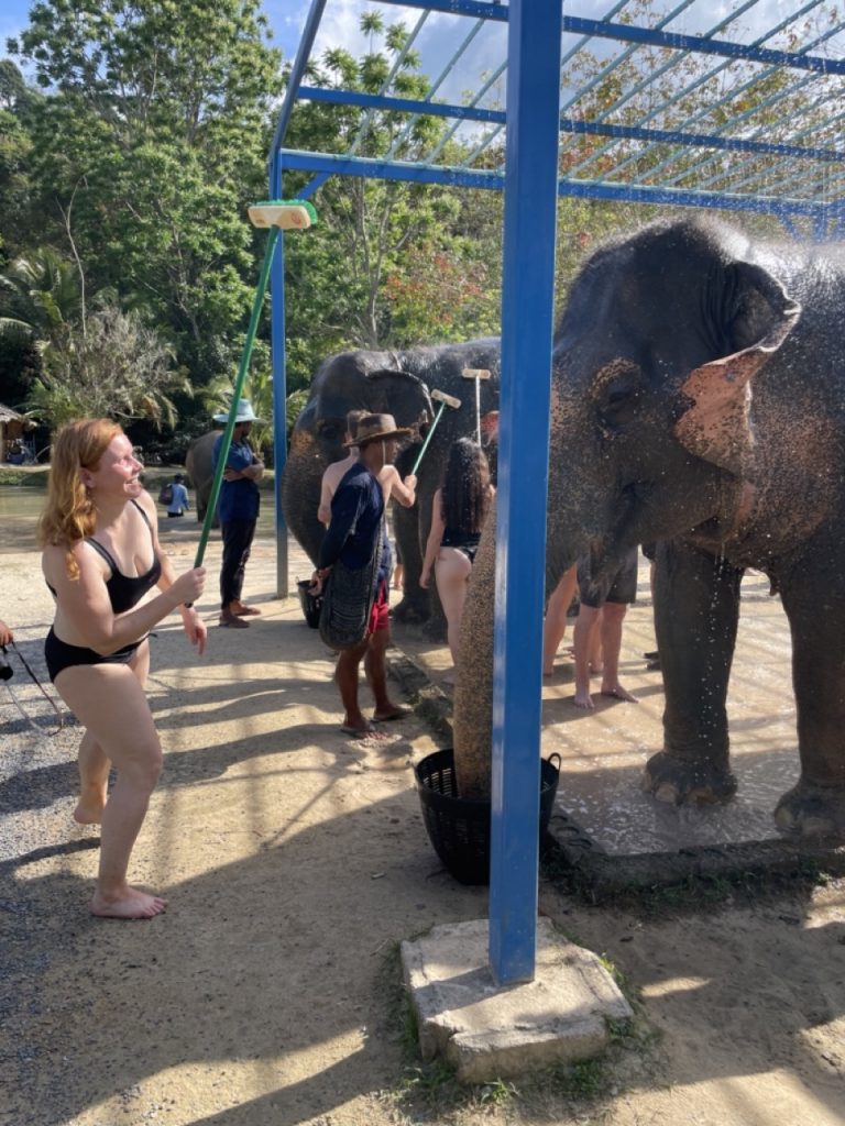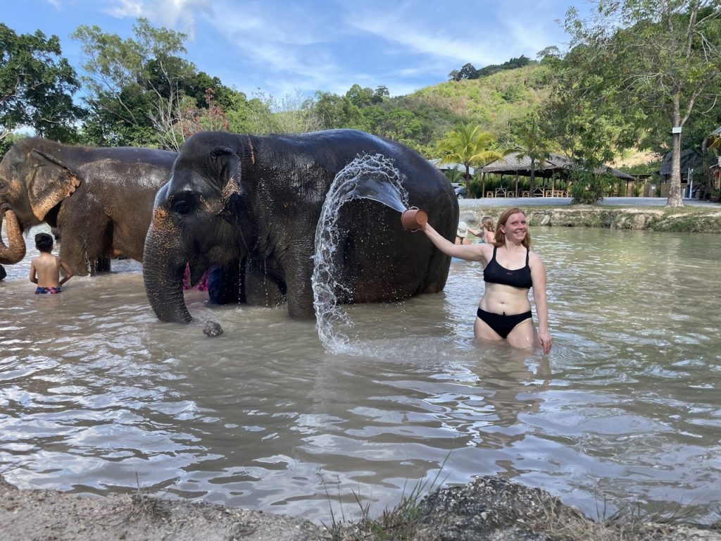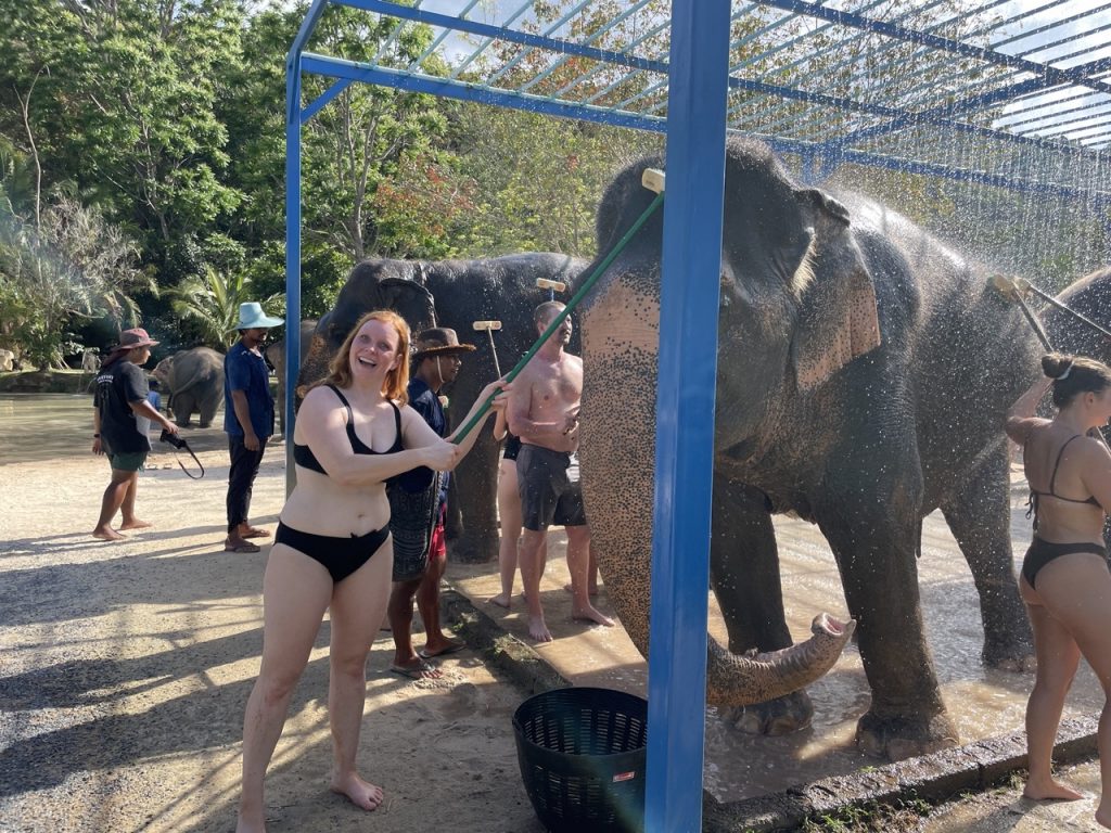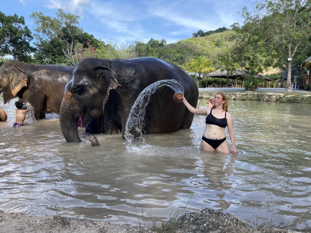 Die Verabschiedung erfolgte durch Mama- und Babyelefant gleich noch mit einer erfrischenden Dusche.