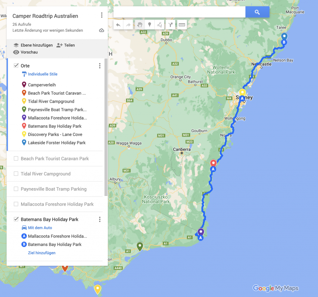 Von Mallacoota ging es dann zu Batemans Bay. Danach dann nach Sydney in den Discovery Park Lane Cove. Nach Sydney sind wir dann zum Lakeside Forster Holiday Park gefahren, wo wir uns jetzt befinden.
